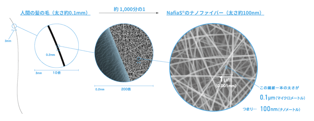 ナノファイバーとは、髪の毛の約1/1000ほどの極細繊維のことなのですが、ナノファイバーを用いた製品が生まれなかったのは、このナノファイバーを量産することが極めて難しかったからです。