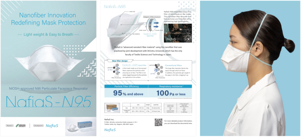 今回出品したのは、「NafiaS-N95」。 米国NIOSH(国立労働安全衛生研究所)のN95規格認証品マスクです。先端ナノファイバー素材 「NafiaS®」 と独自のハイブリッド技術により、薄さと軽さを追求しています。薄型化によって呼吸がしやすく、蒸れにくく、声も通りやすいN95マスクです。